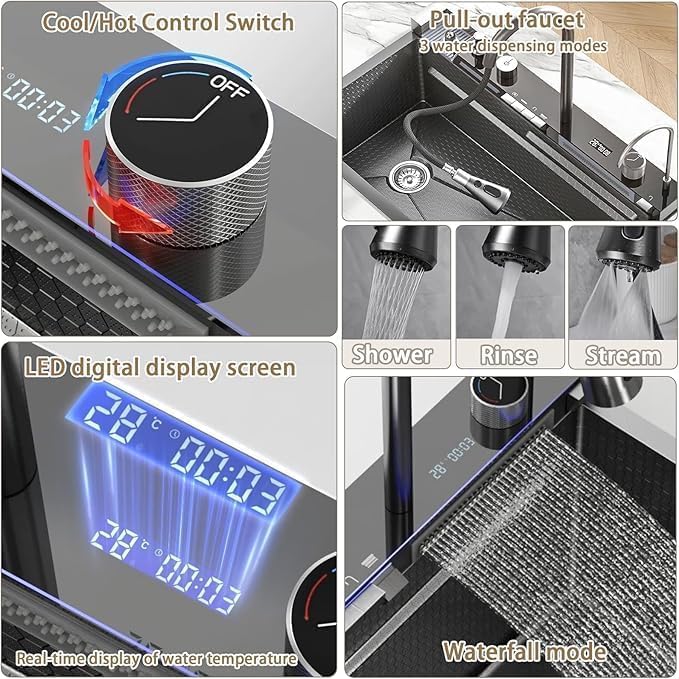 Piano Waterfall Kitchen Sink (30 x 18 x 9 Inches) | Heavy Grade Stainless Steel Sink